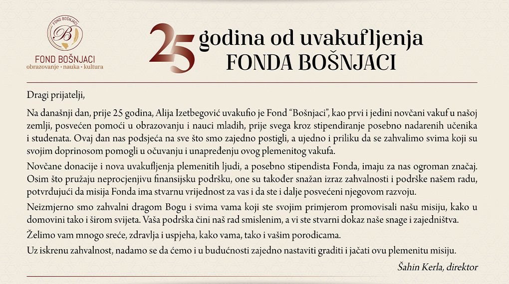 Na današnji dan, prije 25 godina, Alija Izetbegović uvakufio je Fond “Bošnjaci”, kao prvi i jedini novčani vakuf u našoj zemlji, posvećen pomoći u obrazovanju i nauci mladih, prije svega kroz stipendiranje posebno nadarenih učenika i studenata. Ovaj dan nas podsjeća na sve što smo zajedno postigli, a ujedno i priliku da se zahvalimo svima koji su svojim doprinosom pomogli u očuvanju i unapređenju ovog plemenitog vakufa.